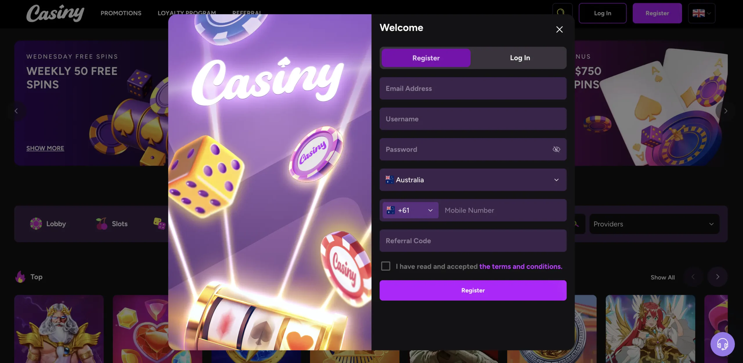 - Casiny Casino Login: Click the “Log In” button in the top right corner and enter your information. If you don’t have an account yet, click “Register” to create one.